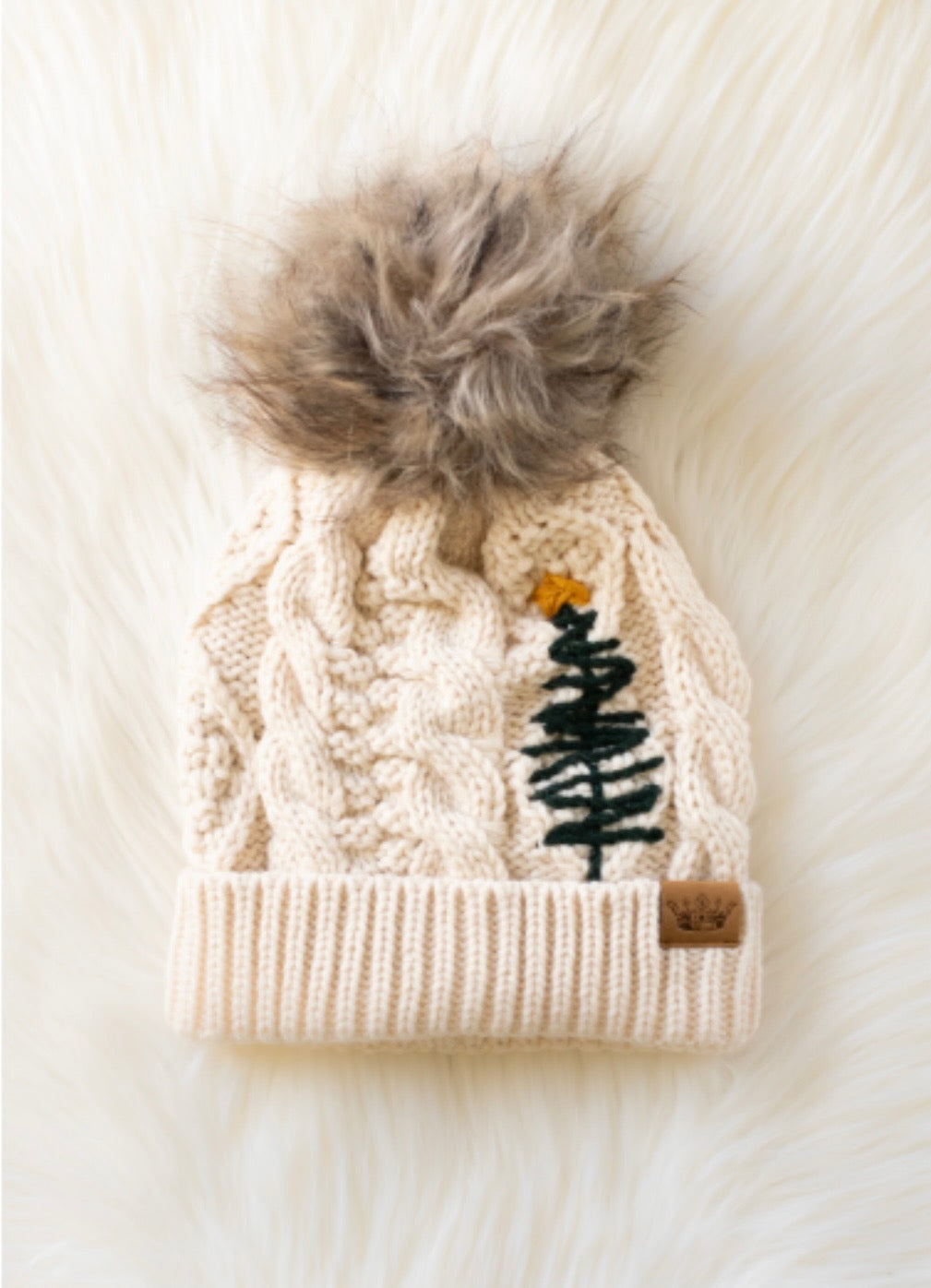 Beige Cable Knit Pom Beanie with Engraved Tree