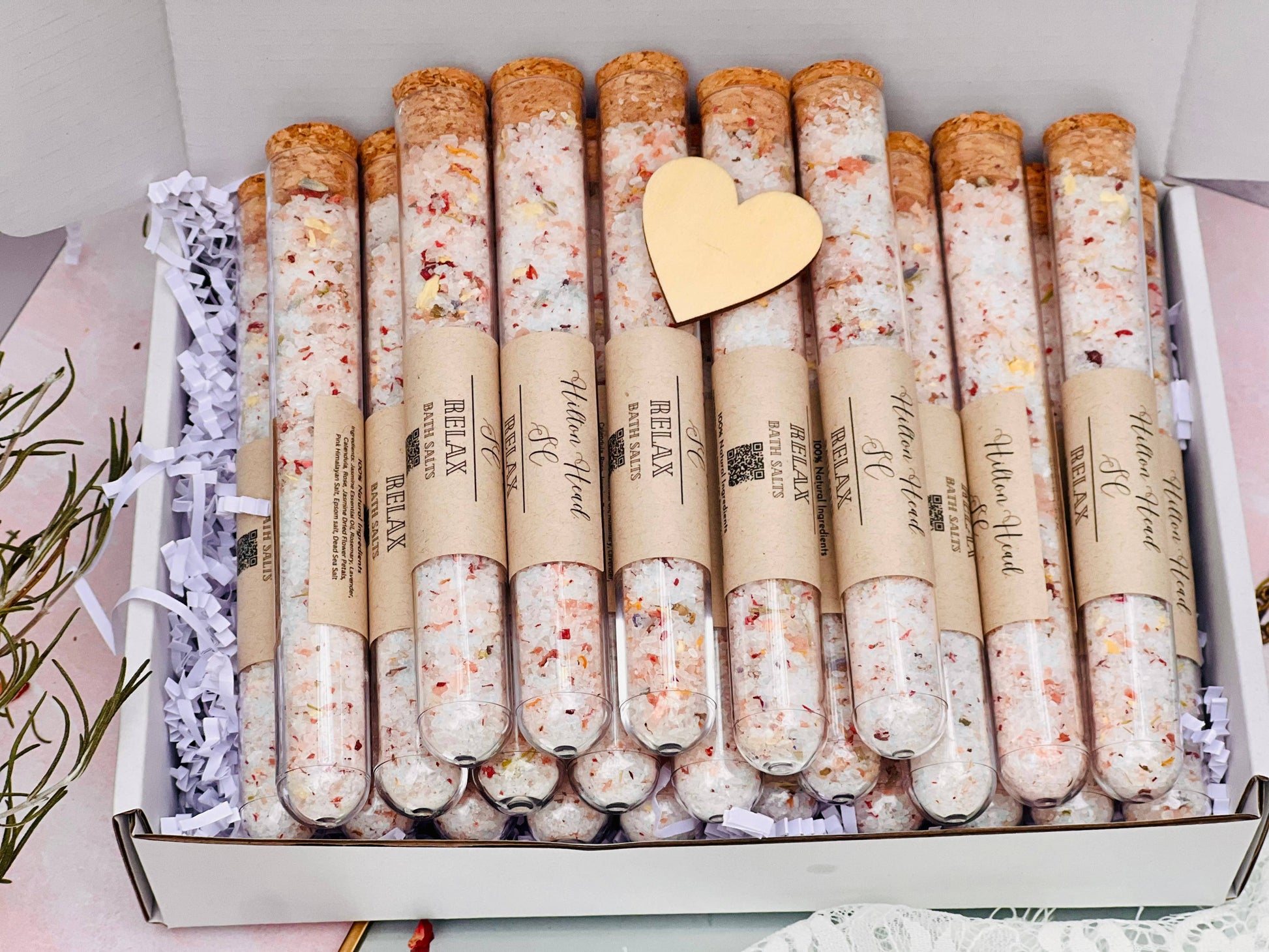 We are pleased to announce our two styles of bath salts! We have the layered look and the mixed variety for ones that don’t wish to have so many floating flowers in the bath water! As your clients pour out the salts in the bath water the lavender scented epsom salts and flower scents are truly the most relaxing experience !