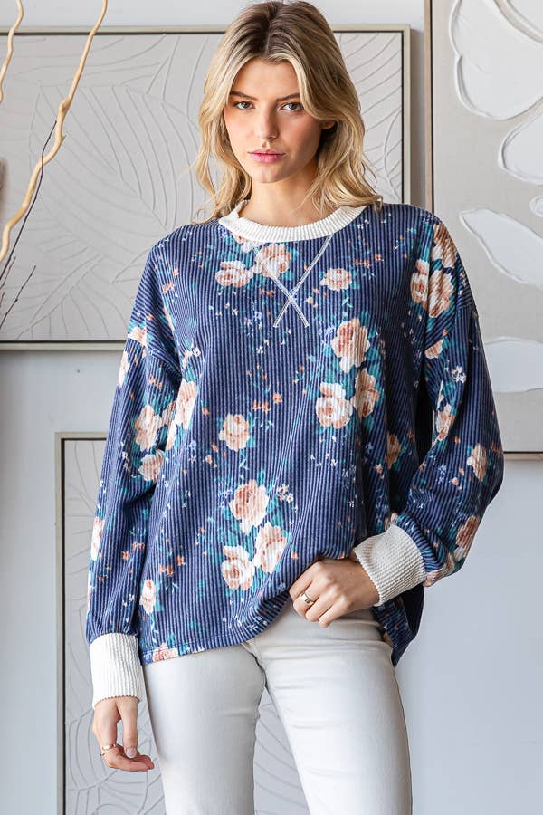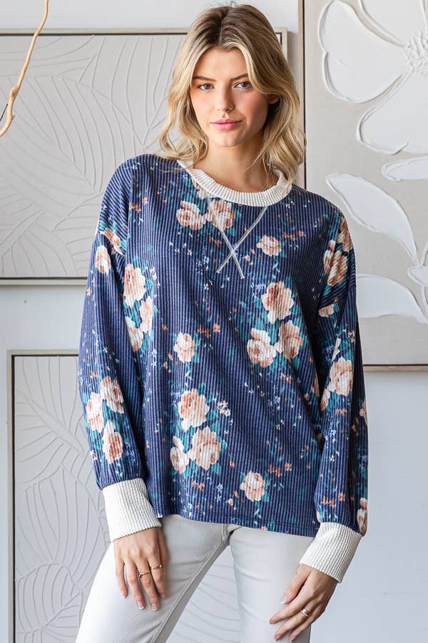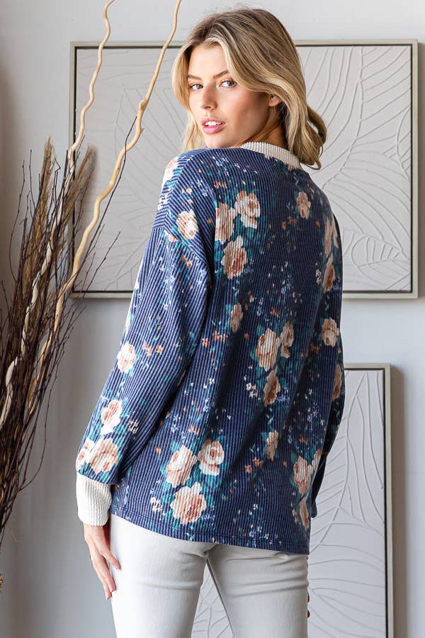 A RIB TOP FEATURING A FLORAL PRINT, DROP SHOULDERS, ROUND NECK, BANDED SLEEVE HEM, LONG SLEEVES, AND A RELAXED FIT. (EACH ONE IS UNIQUE)