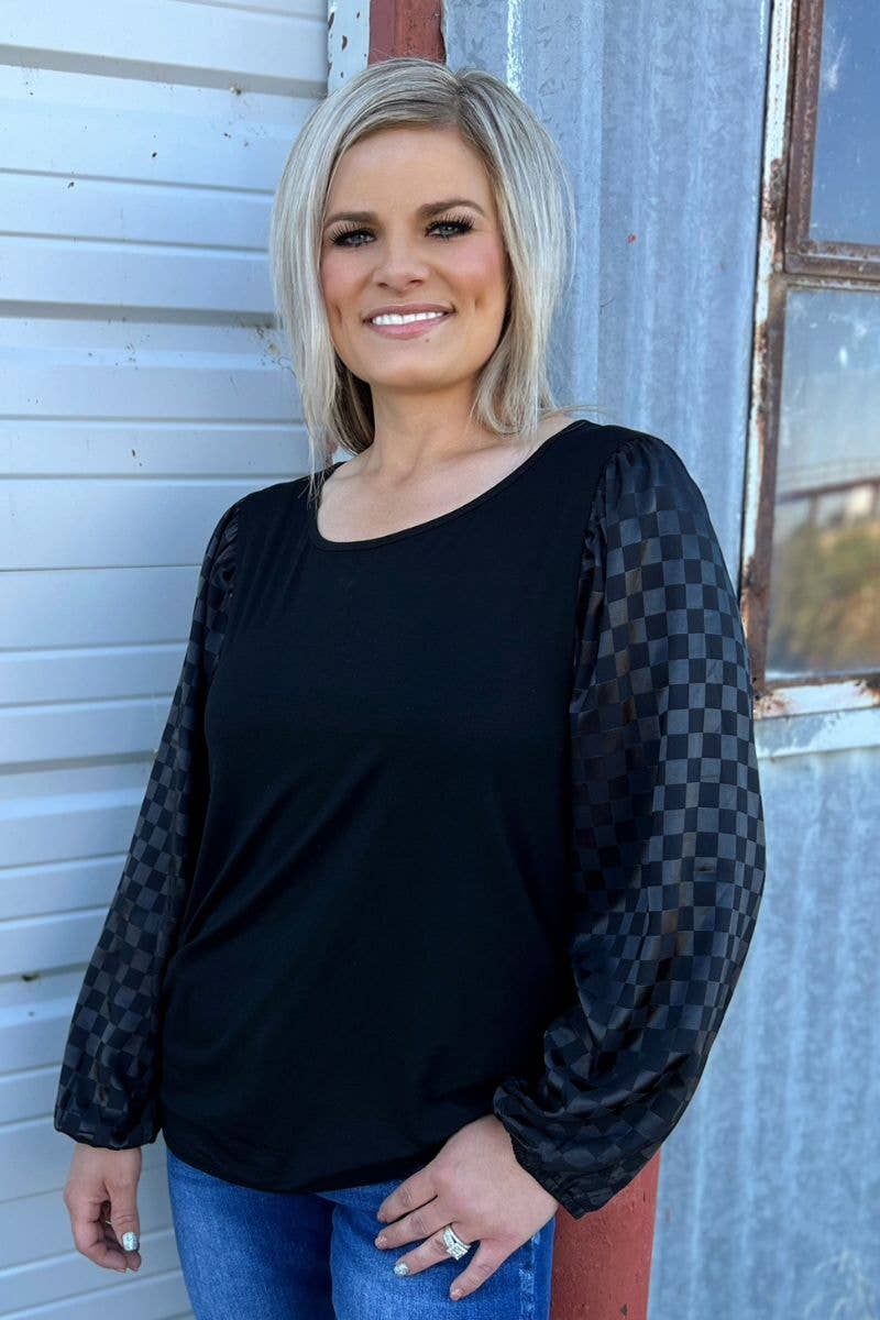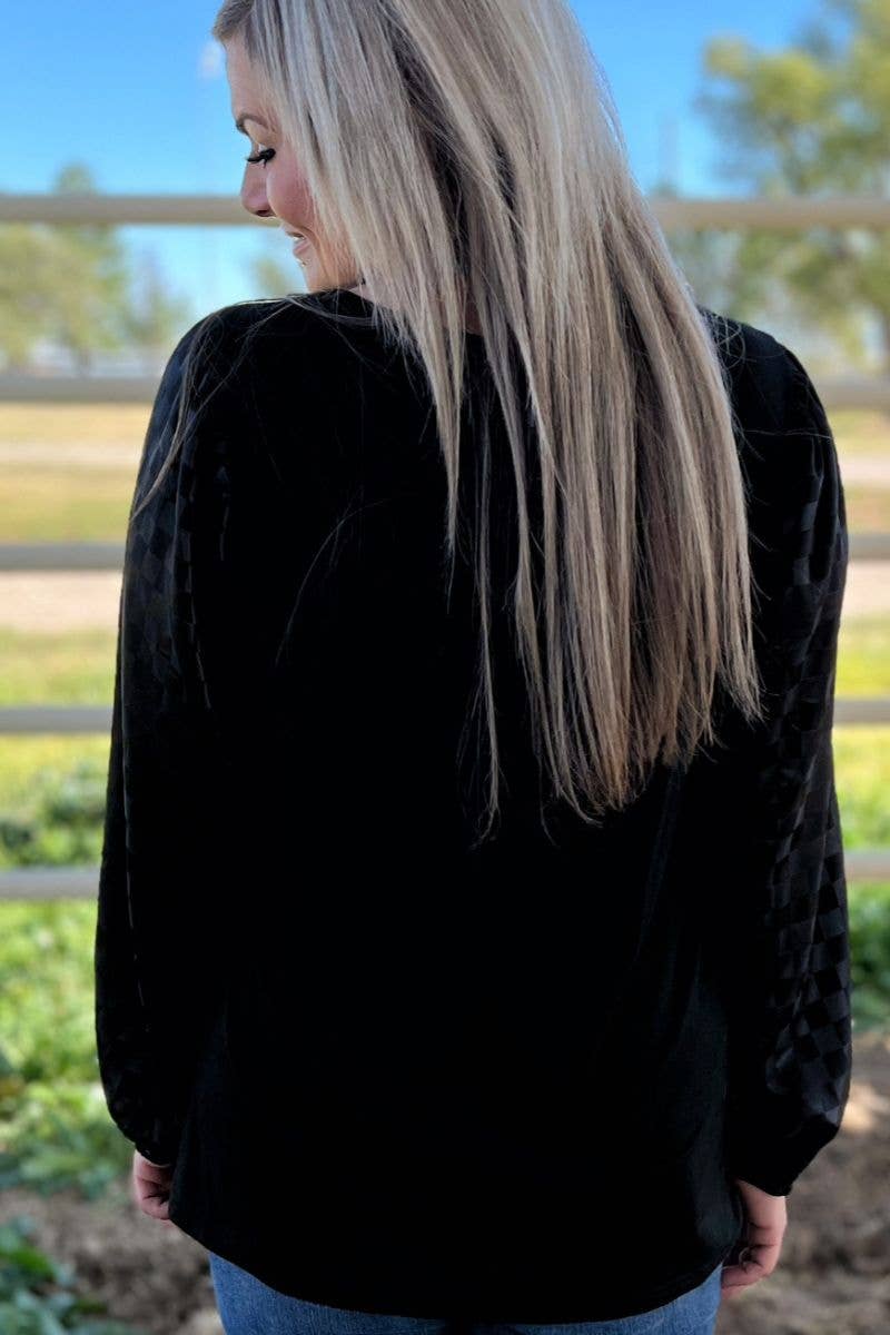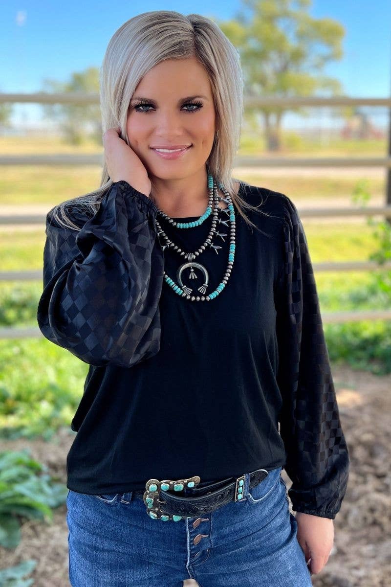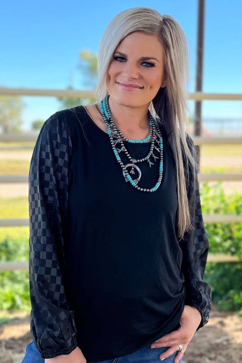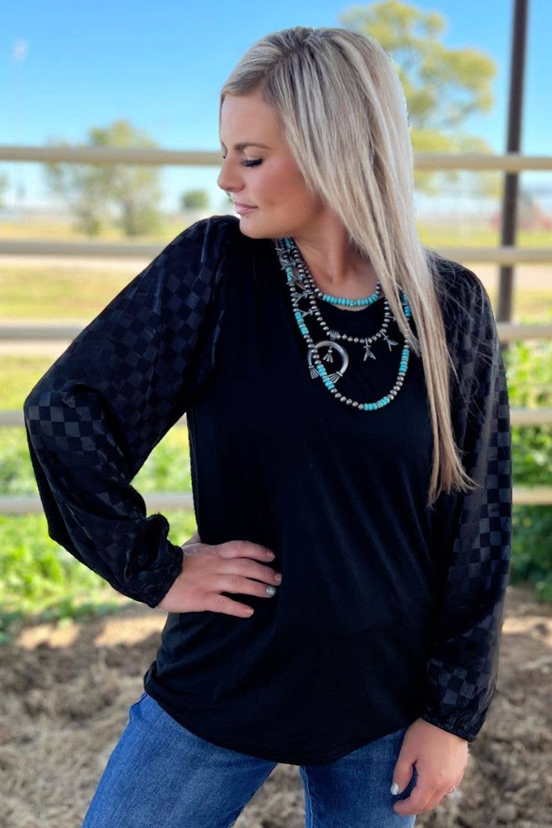 Unleash your inner rebel with our Black on Black Check long sleeve. The bold and edgy checkered design, combined with the sleek black color palette, will make you stand out in any crowd. Embrace your unique style and make a statement with this must-have piece.