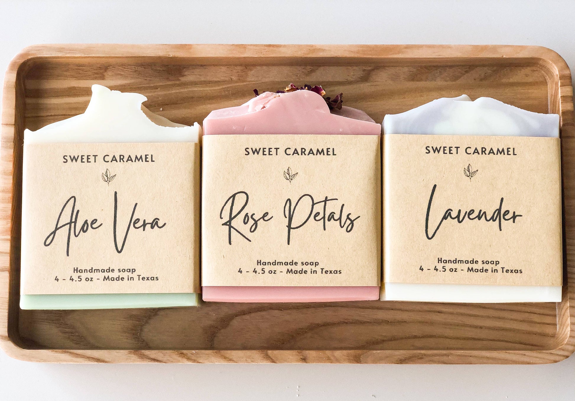 Cold process soaps made with Shea Butter, Sweet Almond Oil, Organic Coconut Oil, Castor Oil and 100% Pure Olive Oil.