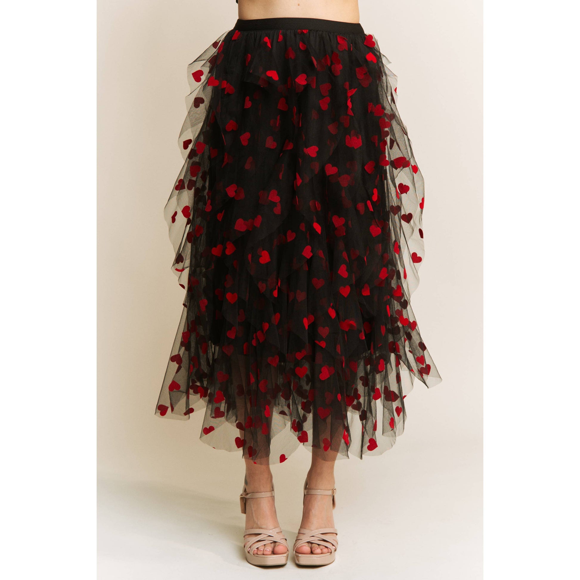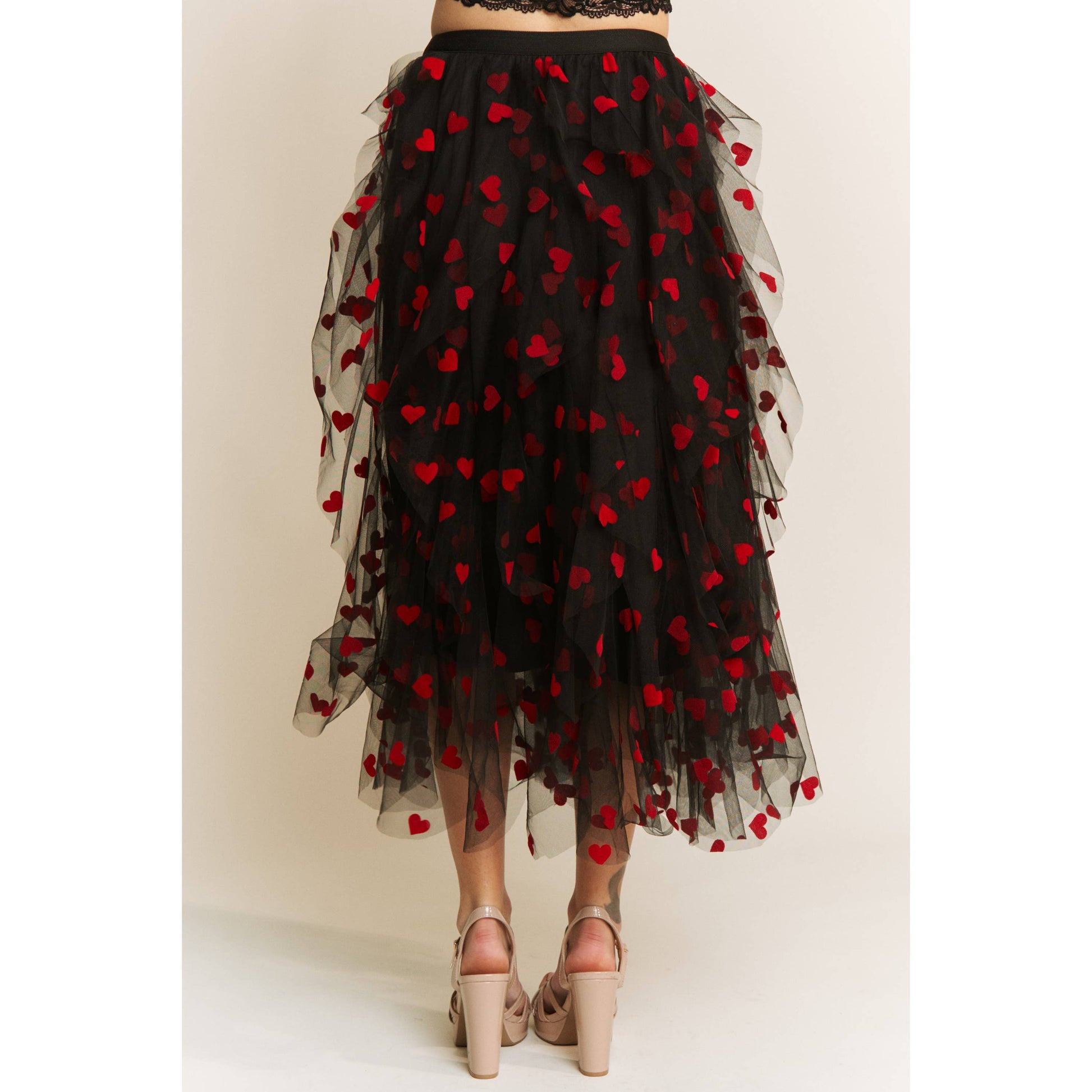 HEART VELVET FLOCKING MESH LAYERED MIDI SKIRT