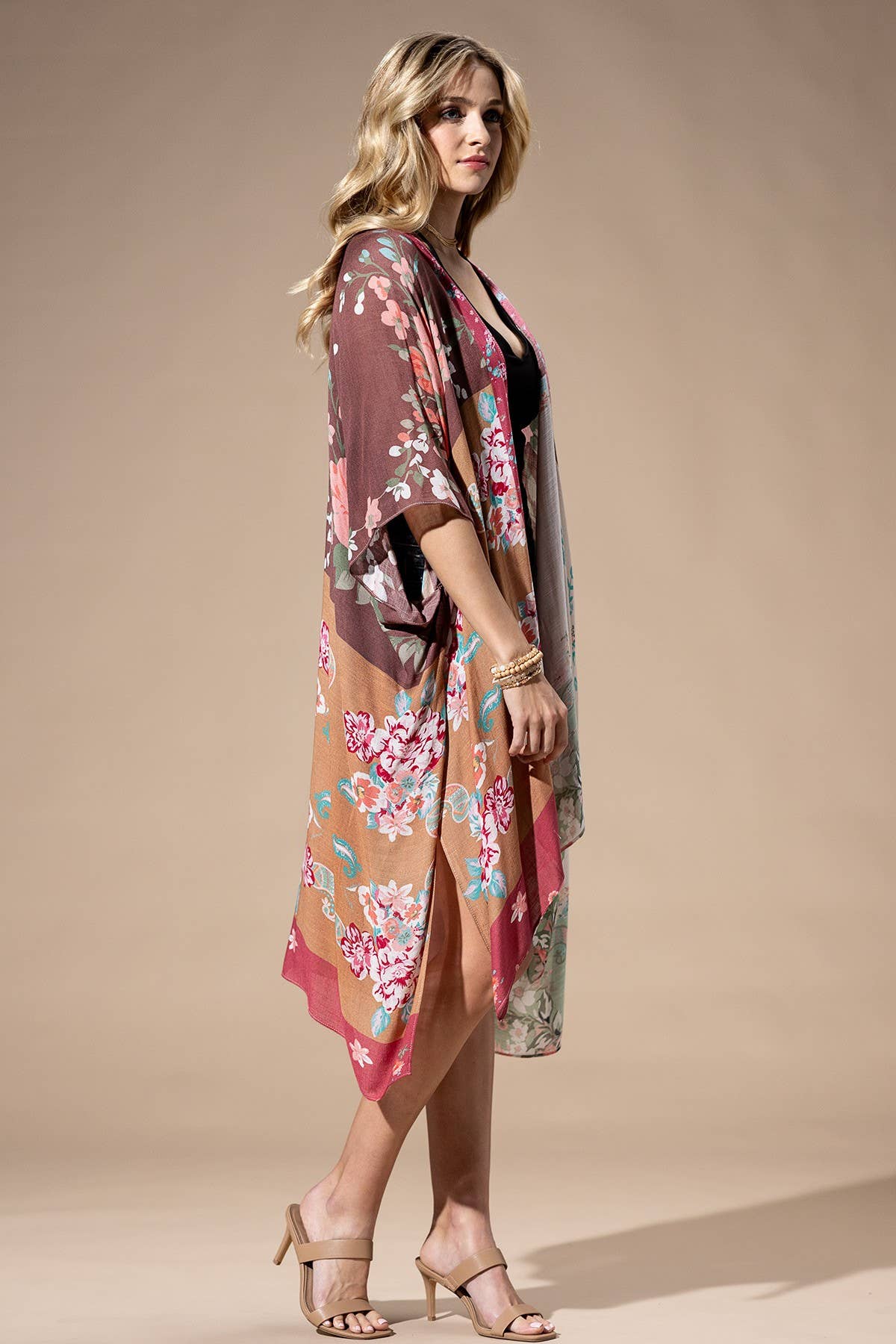Enchanting delicate flowers print light weight kimono. Featuring a harmonious mix of earthy tones like brown, beige, and green with delicate floral patterns, this design adds a vintage-inspired elegance.