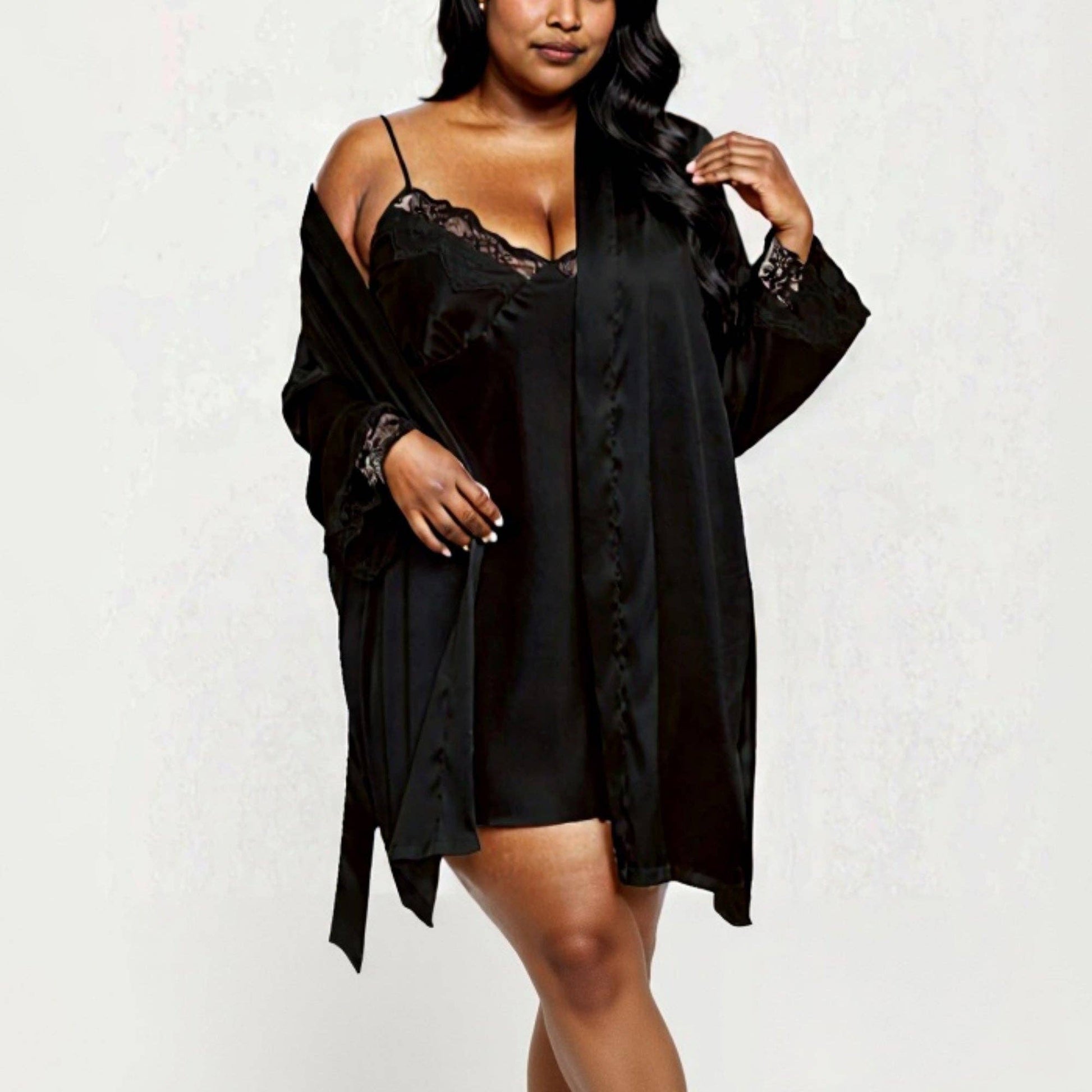PLus Size Satin Robe and Slip Set with Soft Lace Trim on Sleeves and Delicate Sheen